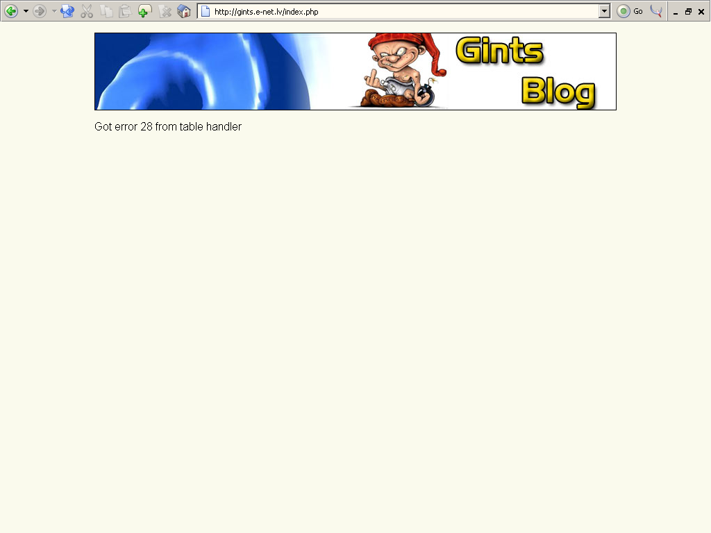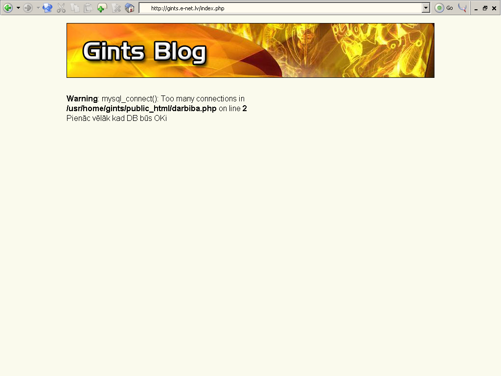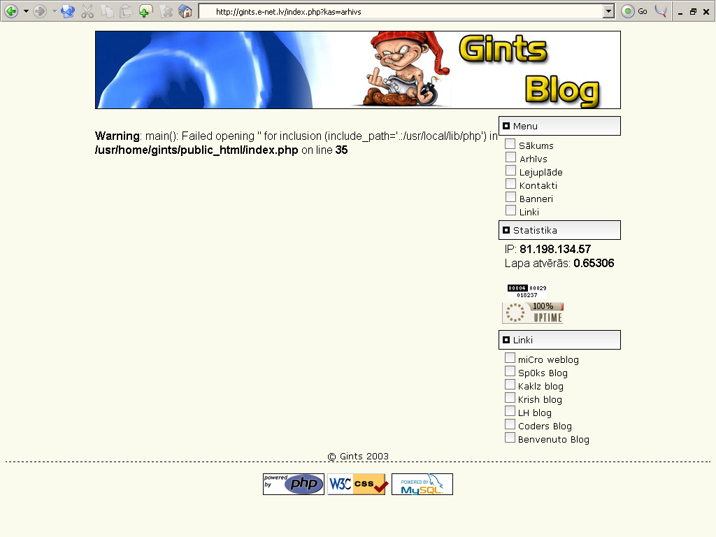 6. Gints www [ Ceturtdiena, 2004. gada 5. februāris , 20:01:19 ] Man lapa negaaja tadēļ ka pats salaidu grīstē, un ja kas tajā log failā me uzvedas jocīgi un lameriski tādēļ, ka mēs ar m|sc sarunājām izjokot SviestZ... tagad laboju savā lapā gļukus, jo nezin kapēc serveris samainija php versijas un man tagad ir gļuki.