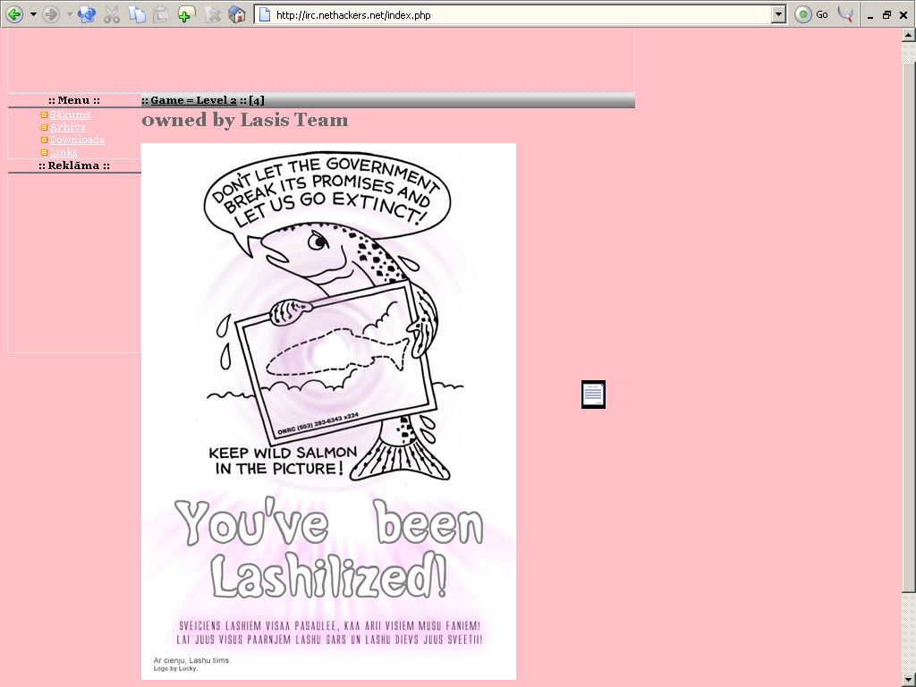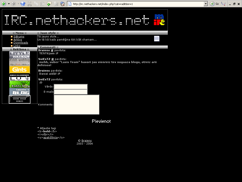 kopija]. Lasu un smejos :D. Storijs ir par to kā viens <SviEsTZ> cenšas uzlauzt misc.hackers.lv lapu. Sākums vien ir to vērts : “<SviEsTZ> es jau tepat eedu, tikai gribu paeest un tad kjerties pie haka”. Lielākais prikols ir tas, ka SviEsTZ nemaz nezin, ka tajā brīdī tai pašā IRC kanālā ir misc.hackers.lv admins. m|sc ir noslēpies zem nikneima d[iddle] un ļauj puikiņām padraiskoties ar viltus admininistrācijas rīkiem. Beigās “kādam”, laikam, tiek nokārts IE. he he. Abet dīvainas lietas notiek ar iesaistīto mājas lapelēm: